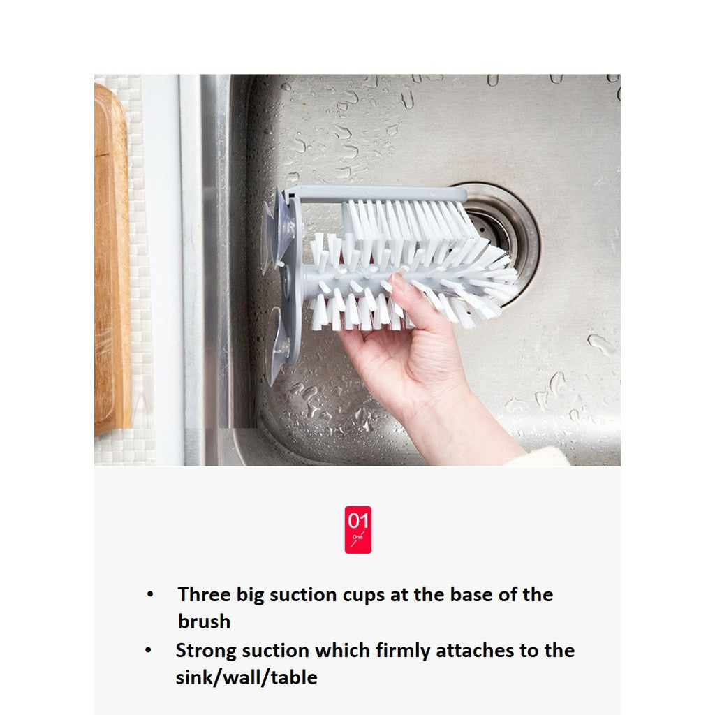 THREE SUCTION CUPS: There are three big suction cups at the base of the brush. These suction cups firmly attaches to the sink/wall/table for efficient cleaning. It is very convenient to use just by sliding your cup or glassware between the two sets of bristles!