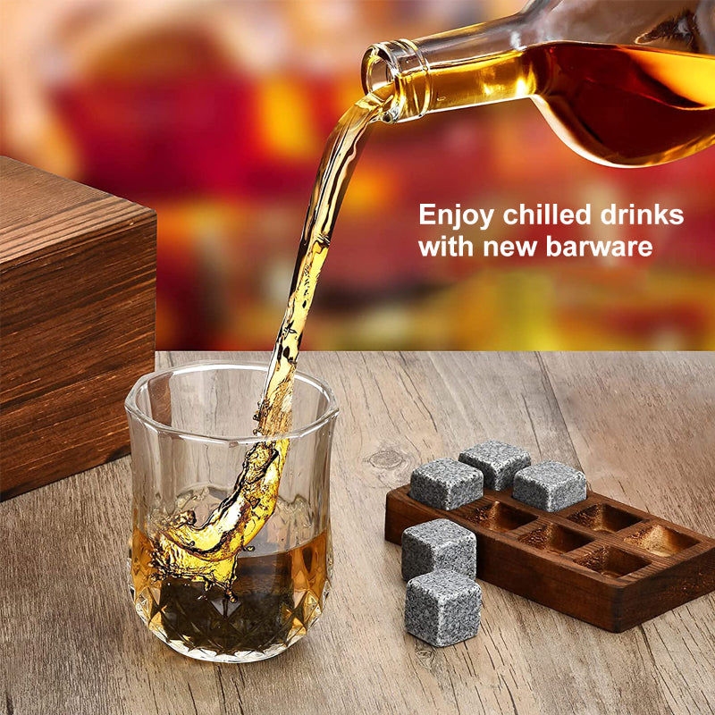 *Package Content: The whiskey stones gift set includes 1 x wooden box, 1 x cloth bag, 6 x ice tartar, 2 x glasses, and 1 x manual. This whiskey set will turn any space into a handsome home bar.